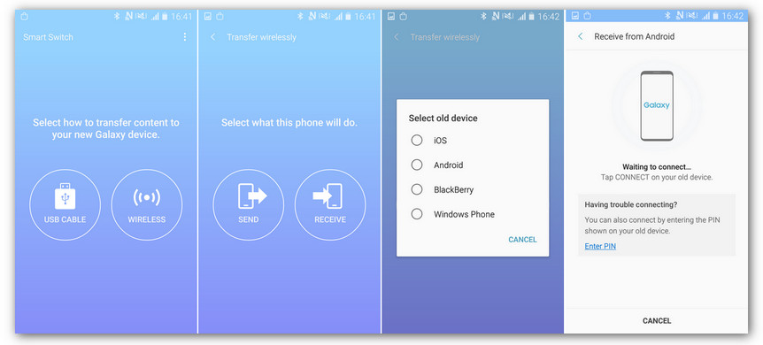 Step 2 : Put them close to each other and run the Smart Switch app on both phones. Then you might be asked to choose the way to connect your two devices, either "USB CABLE" or "WIRELESS".