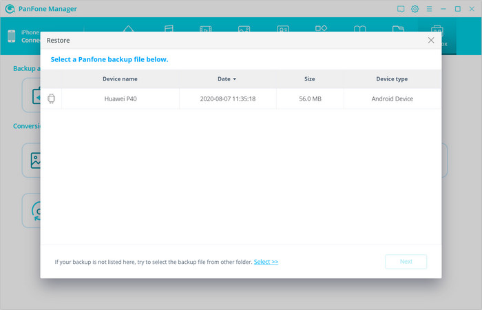 Choose a backup file to recover. All of the available backups will be listed on the checkbox. Click on Next to load. Then, tap on the "Restore" button to recover the backup file back to your mobile phone.