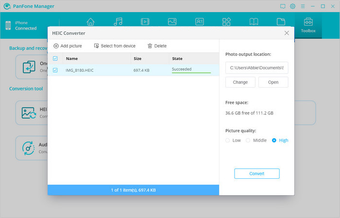 Convert HEIC Photos from Device: Tap 'Select from device' to load all the HEIC format photos from device. Only select those you wish to convert and uncheck or delete those you don't need. On the right sidebar, customize the output location and picture quality (from Low, Middle to Hight). And then tap 'Convert' to proceed.