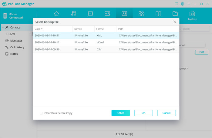 Click on the "Recover" button to recover contacts, messages and call history, notes (iOS device supported only) from the backup you've made previously by PanFone Mobile Manager.